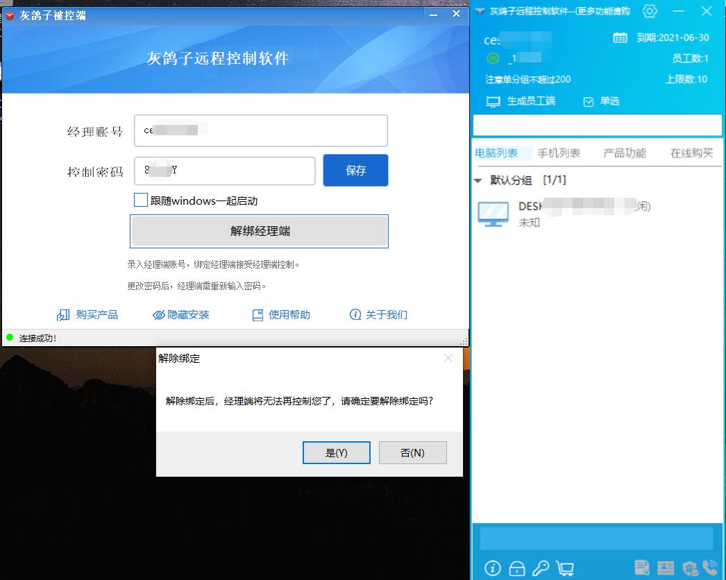 灰鴿子不但支持臨時(shí)性遠(yuǎn)程協(xié)助,還支持無人值守遠(yuǎn)程控制模式。受控端只需要輸入控制者賬號(hào),綁定以后設(shè)置一個(gè)固定密碼即可,密碼是固定的,就方便無人值守的情況下使用。比如小編就經(jīng)常使用無人值守功能控制家里的電腦及與公司電腦實(shí)現(xiàn)文件隨時(shí)互傳。平時(shí)也可以沒事用手機(jī)遠(yuǎn)程控制一下電腦,非常方便。