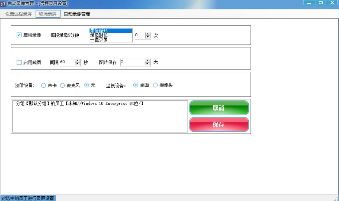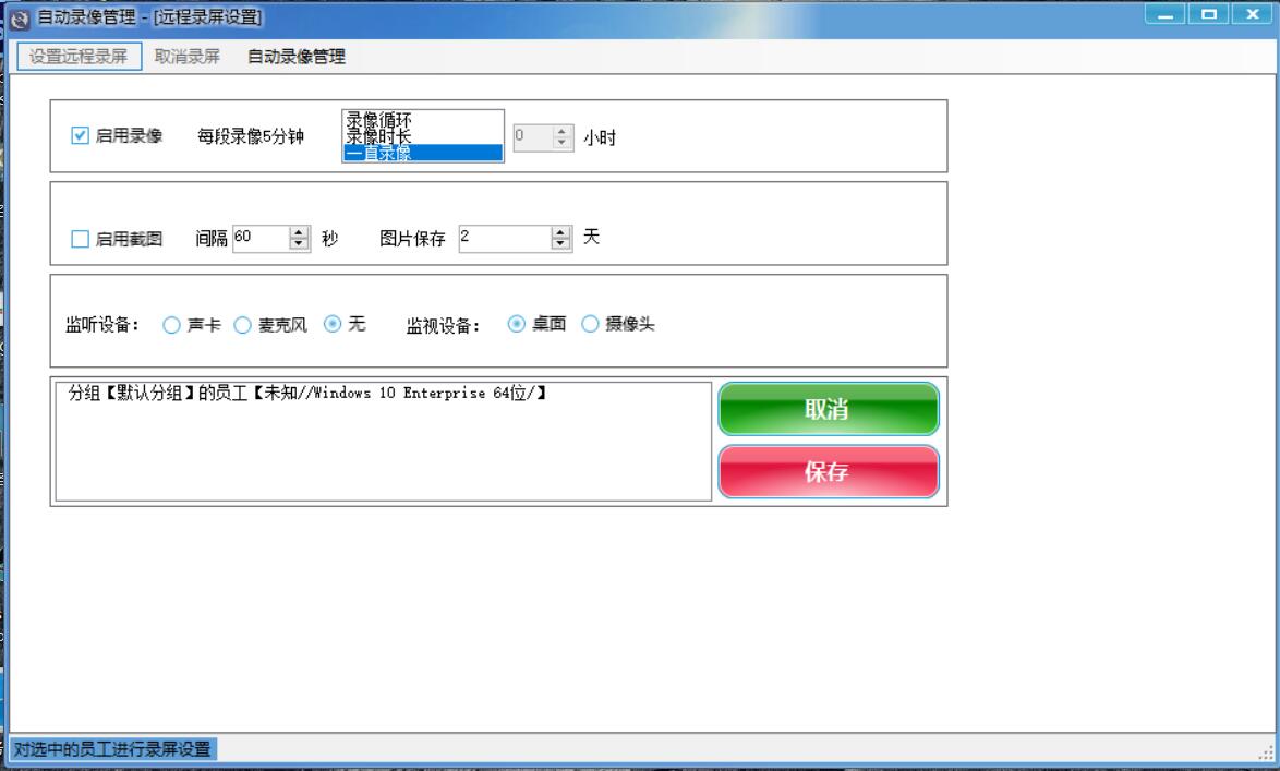 本次更新 界面更簡(jiǎn)單,提供了三種錄制選擇。(錄制時(shí)長不支持小數(shù))循環(huán)錄制、錄制時(shí)長、一直錄像。(互聯(lián)網(wǎng)下不推薦,企業(yè)內(nèi)部推薦)且可以避免右鍵操作即可直接將列表中員工顯示出來并開啟錄像或者取消錄像。? 避免列表處多選不方便。