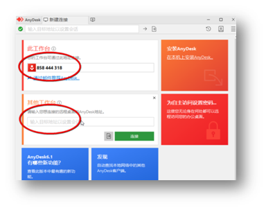 打開后可以看到圖中這樣的主界面,要使用它只看圈出的這兩處數(shù)字框就行。上面這行是當前電腦的9位數(shù)字AnyDesk地址,在下面這個框輸入遠程受控端的9位數(shù)地址然后點擊“連接”,等對方回應就可以了。