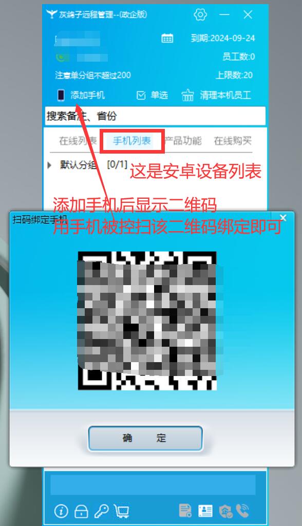 安裝好經(jīng)理端之后,用經(jīng)理端添加手機,會出現(xiàn)一個二維碼。用手機被控掃碼即可。很簡單。主控被控嘛。誰是主控,肯定是你咯。那誰是被控,就是你要控制的手機,或者說需要被控制的手機。手機也能控制電腦,電腦也可以綁定被控。方式不限。綁定即可。手機主控功能全開,電腦控制PC免費版是不能控制手機屏幕和麥克風(fēng)聲音監(jiān)聽的。但是手機主控全開放功能??靵眢w驗吧!