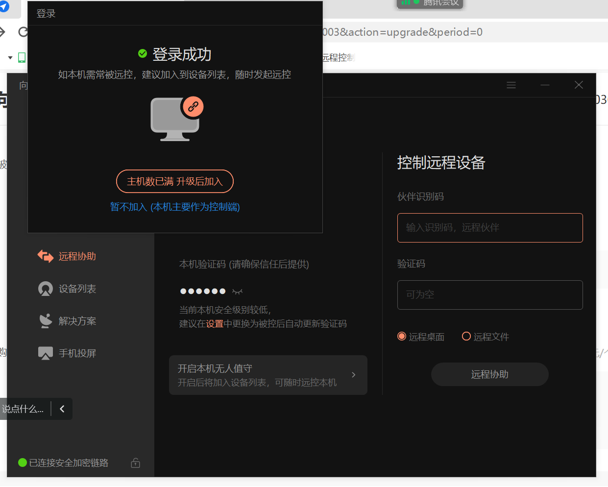 第二款是向日葵,向日葵算是國內(nèi)老牌遠程控制軟件,界面設置也很清楚,在左側(cè)設置了主菜單,右側(cè)則是分成兩個區(qū)域,根據(jù)菜單欄內(nèi)容不同而進行變換。向日葵同樣也以遠程連接為主,進入軟件的第一個界面就是本機設備的識別碼和驗證碼,右側(cè)的另一個區(qū)域則是發(fā)起遠控指令的窗口,獲取被控設備的雙碼,點擊遠程協(xié)助即可連接。缺點就是界面全黑,用的時候有點壓抑感,而且有時候會導致文字難以辨識。
