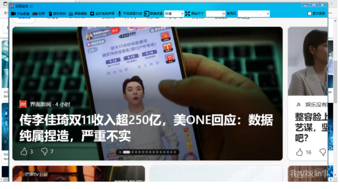 遠程控制時需要右鍵被控端圖標選擇“遠程桌面”就可以控制被控端設備了。實時桌面監(jiān)控,支持自適應分辨率傳輸。功能包括錄像、拍照、鼠標控制、屏蔽鍵鼠、監(jiān)聽系統(tǒng)音、監(jiān)聽麥克風、麥克風對話。其中屏蔽鍵鼠功能可接管對方電腦進行操作。缺點就是界面有古早感,有點像早期的QQ,而且因為他也做企業(yè)安全,所以可能功能上對個人來講太多了。