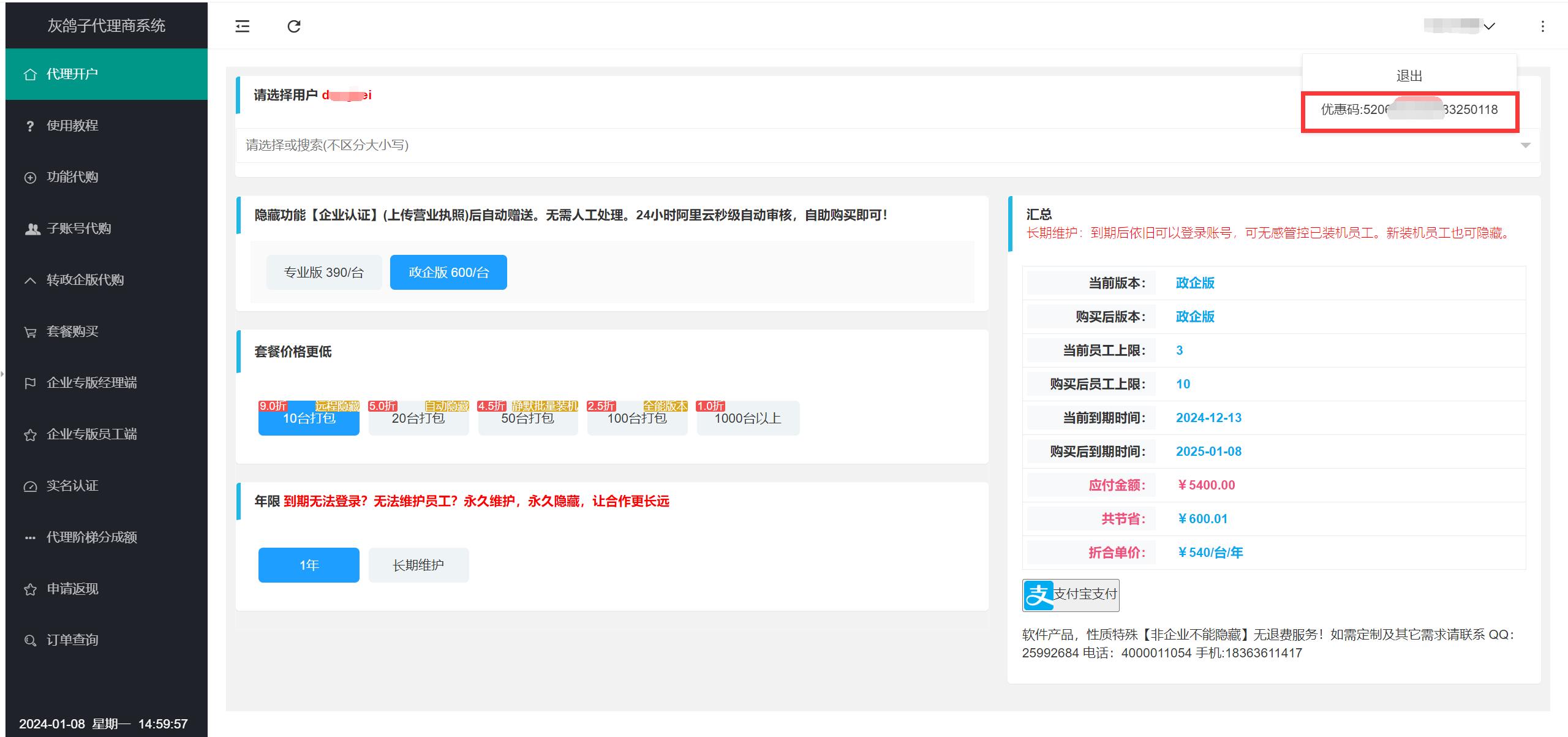 直營(yíng)代理是灰鴿子代理系統(tǒng)的一種重要形式。在購(gòu)買灰鴿子之后,客戶將自動(dòng)獲得直營(yíng)代理資格。通過(guò)簡(jiǎn)單的操作,客戶可以在個(gè)人的SaaS后臺(tái)左側(cè)功能欄目中找到“我的代理中心”菜單,并登錄該中心。在登錄后,客戶可以在右上角看到自己的優(yōu)惠券。這些優(yōu)惠券可以在購(gòu)買灰鴿子產(chǎn)品時(shí)使用,幫助客戶小額減免付款額,并自動(dòng)建立綁定關(guān)系。這種直營(yíng)代理模式為小型企業(yè)或個(gè)人提供了靈活、便捷的代理服務(wù),使他們能夠更好地開展業(yè)務(wù)。