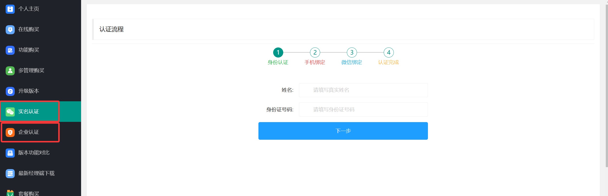 2、左側(cè)菜單欄找到企業(yè)認(rèn)證。如果沒有購(gòu)買,會(huì)提醒你購(gòu)買并做完個(gè)人認(rèn)證。也就是說。做企業(yè)認(rèn)證的前提是:1、購(gòu)買產(chǎn)品。2、做完個(gè)人認(rèn)證。