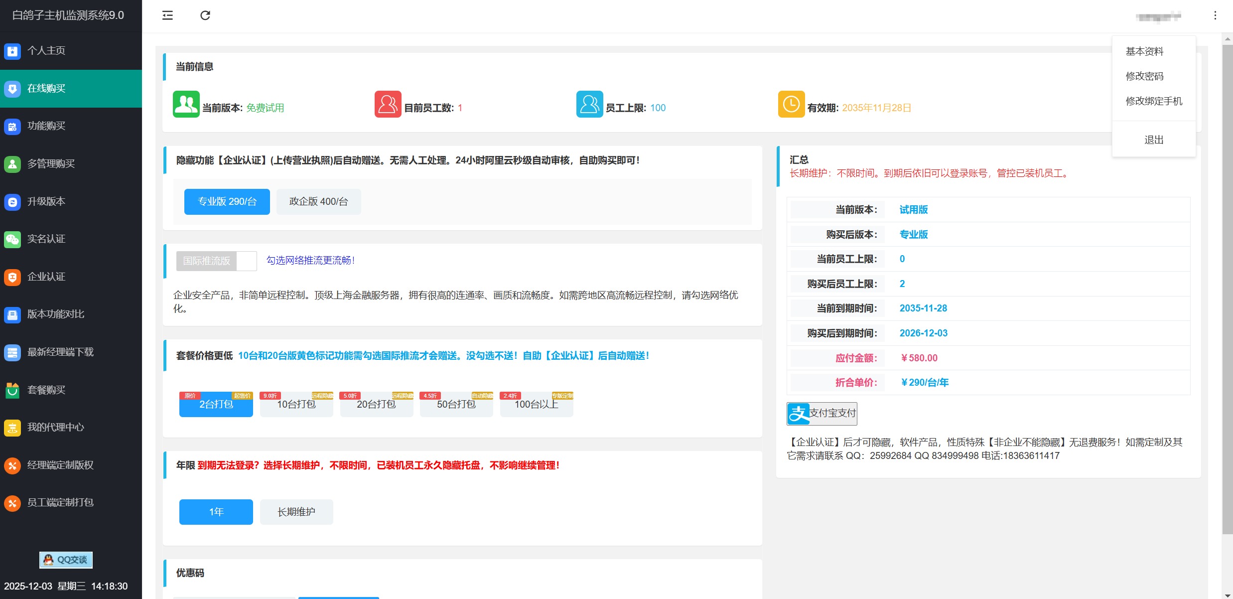 登錄賬號之后,右上角可以查看自己注冊的基本資料、修改密碼、修改手機(jī)等等。 左側(cè)在線購買頁面,可以看到版本和價格。開始可以買個起售價,專業(yè)版2臺,企業(yè)版3臺起售。后續(xù)好用可以繼續(xù)升級。升級就是購買。具體信息在右側(cè)可以看到。