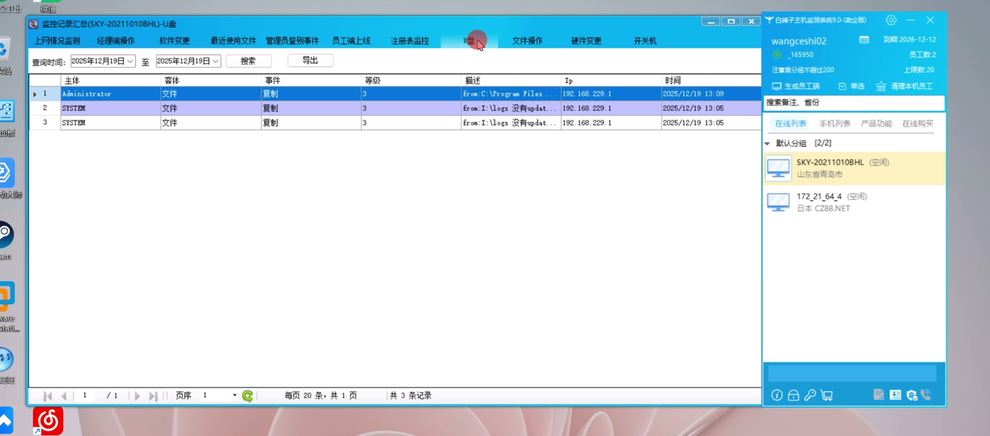 設備狀態(tài)可掌控只是第一步,操作行為可追溯才是規(guī)范化管理的核心?;银澴悠髽I(yè)版提供后臺自動錄像功能,可對遠程操作全程錄制,支持帶聲錄制(聲卡、麥克風均可捕獲),錄像文件直接存儲于管理端,便于事后審計。文件操作記錄功能詳細追蹤文件的復制、剪切、刪除、重命名等行為;U盤拷入拷出記錄對移動存儲設備進行全程管控,有效防范數(shù)據(jù)外泄。網(wǎng)址訪問記錄、郵件審計(支持HTTPS解密126、163、QQ等郵箱)、搜索內容監(jiān)控等功能,則從多個維度還原員工的上網(wǎng)行為軌跡。
